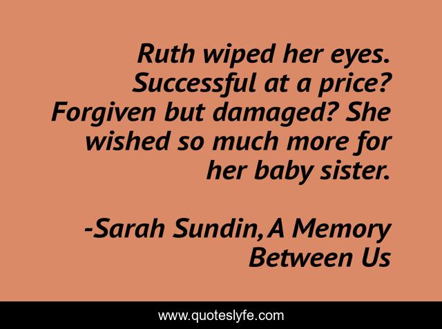This page presents the quote "Ruth wiped her eyes. Successful at a price? Forgiven but damaged? She wished so much more for her baby sister.". Author of this quote is Sarah Sundin, A Memory Between Us. This quote is about world-war-ii, historical-romance,.