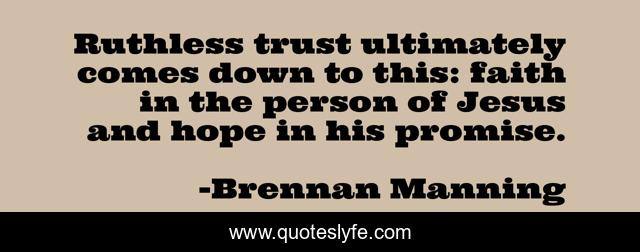 This page presents the quote "Ruthless trust ultimately comes down to this: faith in the person of Jesus and hope in his promise.". Author of this quote is Brennan Manning. This quote is about down, faith, trust,.
