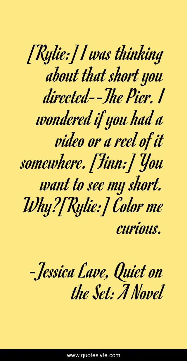 This page presents the quote "[Rylie:] I was thinking about that short you directed--The Pier. I wondered if you had a video or a reel of it somewhere. [Finn:] You want to see my short. Why?[Rylie:] Color me curious.". Author of this quote is Jessica Lave, Quiet on the Set: A Novel. .