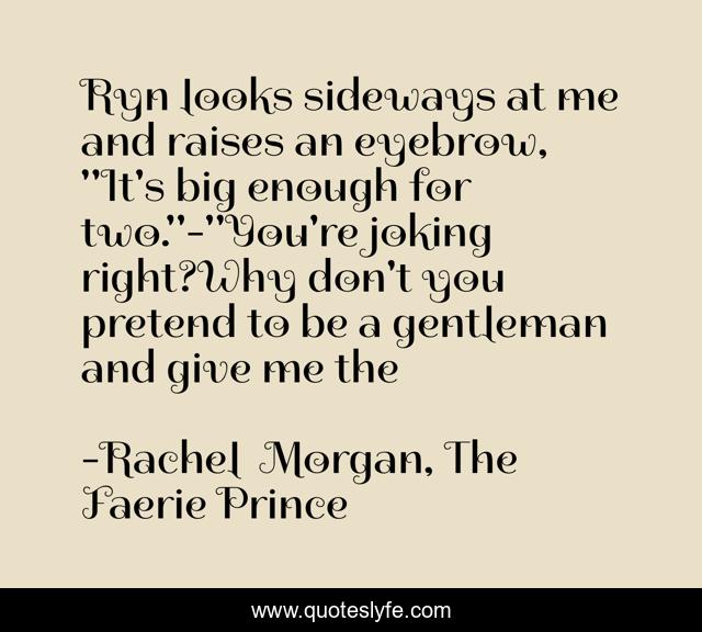 This page presents the quote "Ryn looks sideways at me and raises an eyebrow, "It's big enough for two."-"You're joking right?Why don't you pretend to be a gentleman and give me the". Author of this quote is Rachel Morgan, The Faerie Prince. .