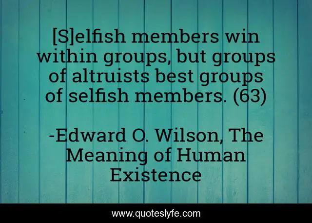 This page presents the quote "[S]elfish members win within groups, but groups of altruists best groups of selfish members. (63)". Author of this quote is Edward O. Wilson, The Meaning of Human Existence. This quote is about selfishness, alturism, competition, cooperation,.