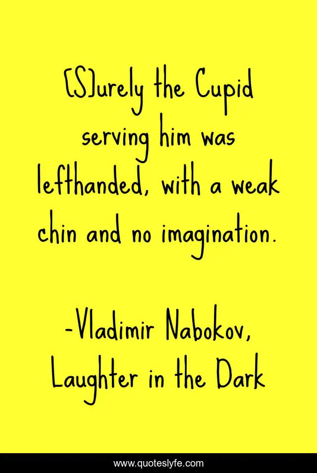 This page presents the quote "[S]urely the Cupid serving him was lefthanded, with a weak chin and no imagination.". Author of this quote is Vladimir Nabokov, Laughter in the Dark. This quote is about imagination, weak, chins, cupid, left-handed,.