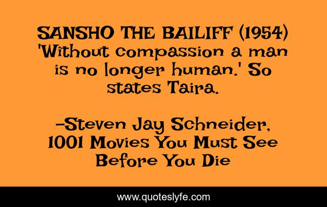 This page presents the quote "SANSHO THE BAILIFF (1954) 'Without compassion a man is no longer human.' So states Taira.". Author of this quote is Steven Jay Schneider, 1001 Movies You Must See Before You Die. .