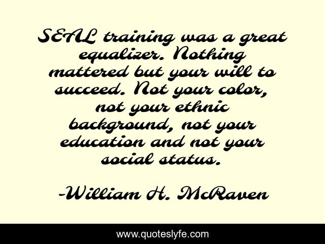 This page presents the quote "SEAL training was a great equalizer. Nothing mattered but your will to succeed. Not your color, not your ethnic background, not your education and not your social status.". Author of this quote is William H. McRaven. This quote is about color, great, training,.