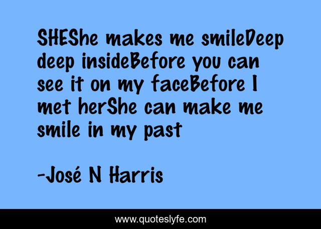 This page presents the quote "SHEShe makes me smileDeep deep insideBefore you can see it on my faceBefore I met herShe can make me smile in my past". Author of this quote is José N Harris. This quote is about joy-of-life, love, pain, affection, hurt,.