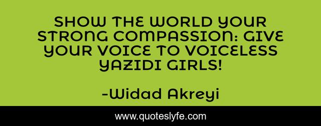 This page presents the quote "SHOW THE WORLD YOUR STRONG COMPASSION: GIVE YOUR VOICE TO VOICELESS YAZIDI GIRLS!". Author of this quote is Widad Akreyi. This quote is about widad-akrawi, ezidis, christians, human-rights, violence-against-women, peace, yazidis, civil-society, defend-international,.
