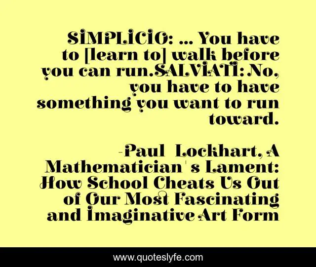 This page presents the quote "SIMPLICIO: ... You have to [learn to] walk before you can run.SALVIATI: No, you have to have something you want to run toward.". Author of this quote is Paul Lockhart, A Mathematician's Lament: How School Cheats Us Out of Our Most Fascinating and Imaginative Art Form. This quote is about motivation, inspiration, learning-process, philosophy-of-education,.