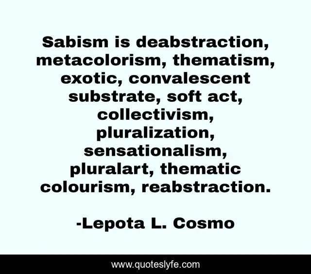 "Lepota L. Cosmo Quotes." Quoteslyfe.com, 2025. Fri. 05 Dec. 2025. <https://www.quoteslyfe.com/quote/Sabism-is-deabstraction-metacolorism-thematism-exotic-convalescent-65942>.
