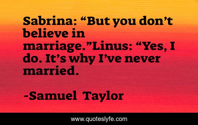This page presents the quote "Sabrina: “But you don’t believe in marriage.”Linus: “Yes, I do. It’s why I’ve never married.". Author of this quote is Samuel Taylor. This quote is about single-life, marriage, waiting-for-true-love,.