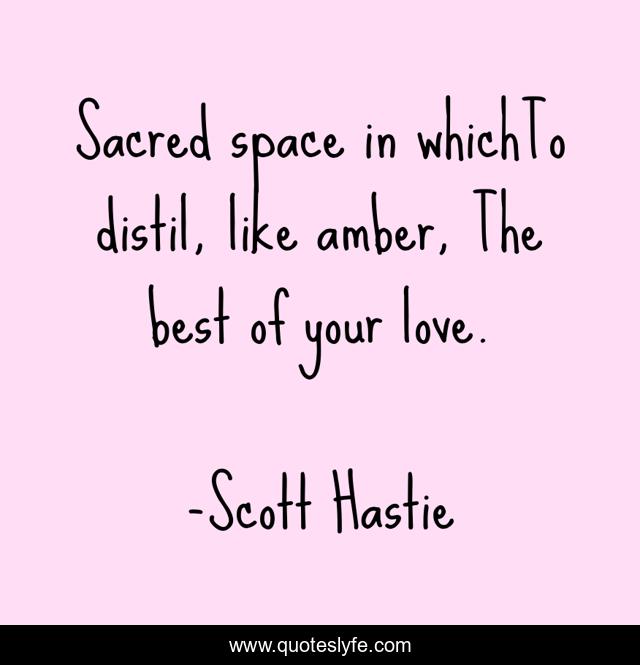 This page presents the quote "Sacred space in whichTo distil, like amber, The best of your love.". Author of this quote is Scott Hastie. This quote is about amber, poem, love, space, scared, poetry, wisdom, best, which,.
