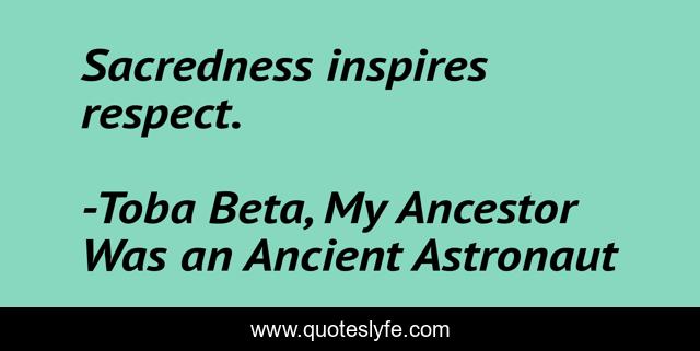 This page presents the quote "Sacredness inspires respect.". Author of this quote is Toba Beta, My Ancestor Was an Ancient Astronaut. This quote is about respect, sacredness,.