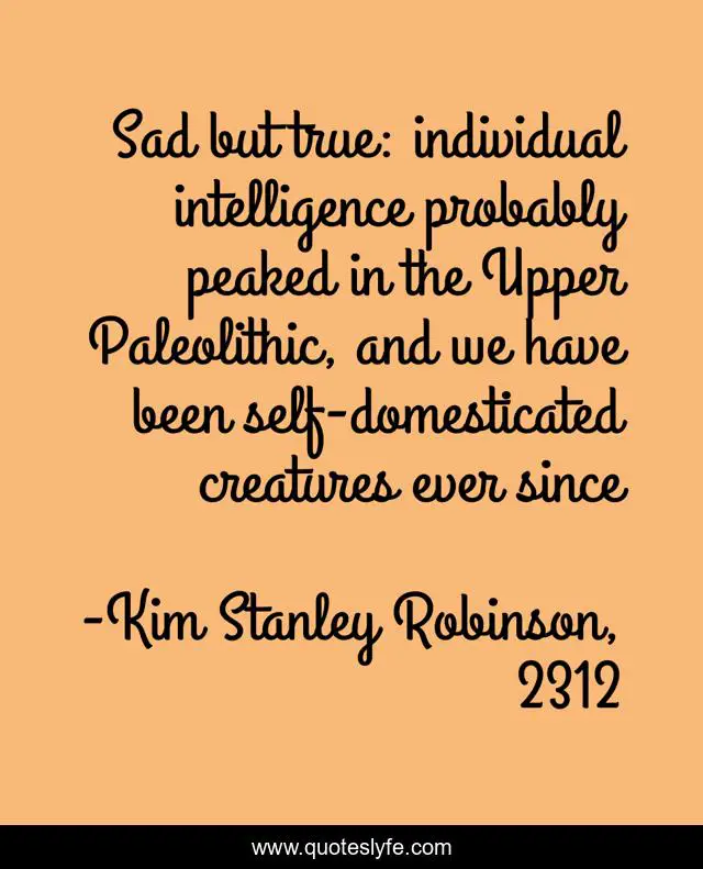 This page presents the quote "Sad but true: individual intelligence probably peaked in the Upper Paleolithic, and we have been self-domesticated creatures ever since". Author of this quote is Kim Stanley Robinson, 2312. This quote is about intelligence, evolution,.