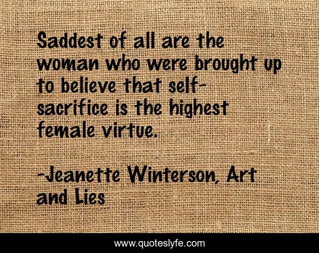 This page presents the quote "Saddest of all are the woman who were brought up to believe that self-sacrifice is the highest female virtue.". Author of this quote is Jeanette Winterson, Art and Lies. This quote is about jeanette-winterson, art-and-lies, feminism,.