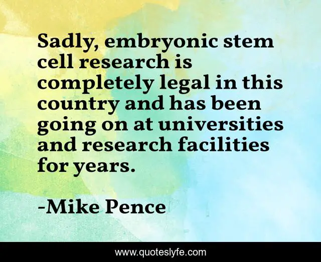 This page presents the quote "Sadly, embryonic stem cell research is completely legal in this country and has been going on at universities and research facilities for years.". Author of this quote is Mike Pence. This quote is about country, legal, research,.