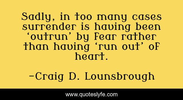 This page presents the quote "Sadly, in too many cases surrender is having been ‘outrun’ by fear rather than having ‘run out’ of heart.". Author of this quote is Craig D. Lounsbrough. This quote is about desire, heart, passionate, fearful, scared, defeat, abandonment, drive, defeated,.