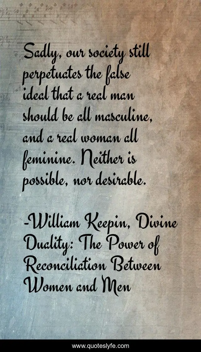 This page presents the quote "Sadly, our society still perpetuates the false ideal that a real man should be all masculine, and a real woman all feminine. Neither is possible, nor desirable.". Author of this quote is William Keepin, Divine Duality: The Power of Reconciliation Between Women and Men. This quote is about gender-inequality, gender, reconciliation, gender-stereotypes, society,.
