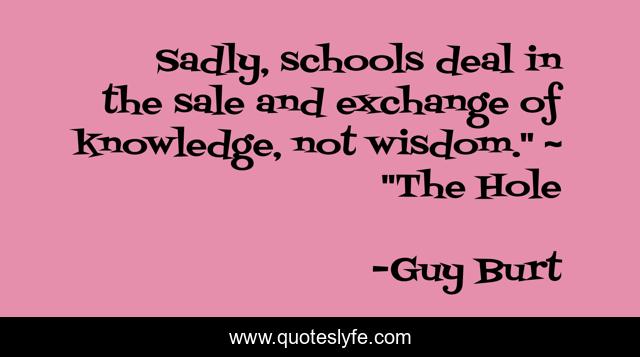 This page presents the quote "Sadly, schools deal in the sale and exchange of knowledge, not wisdom." ~ "The Hole". Author of this quote is Guy Burt. .
