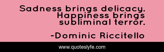 This page presents the quote "Sadness brings delicacy. Happiness brings subliminal terror.". Author of this quote is Dominic Riccitello. This quote is about quote, delicacy, sad, sadness, terror, happiness, happy,.