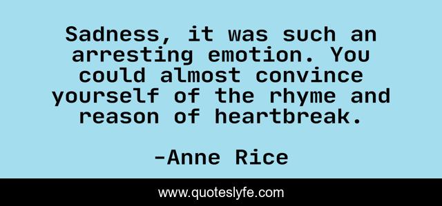 This page presents the quote "Sadness, it was such an arresting emotion. You could almost convince yourself of the rhyme and reason of heartbreak.". Author of this quote is Anne Rice. This quote is about enthusiasm, sadness, inspirational, emotional-pain,.