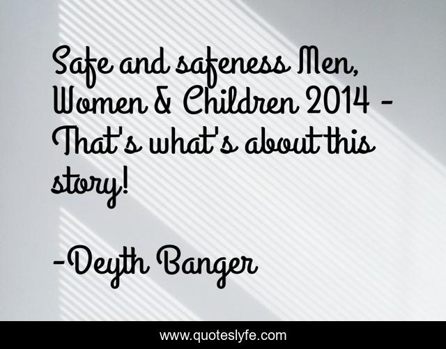This page presents the quote "Safe and safeness Men, Women & Children 2014 - That's what's about this story!". Author of this quote is Deyth Banger. This quote is about story, safe, safeness,.