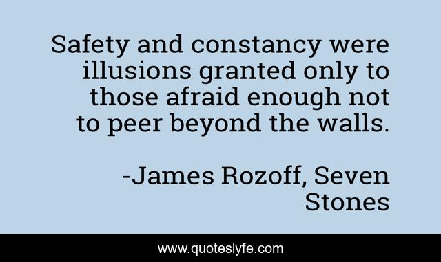 This page presents the quote "Safety and constancy were illusions granted only to those afraid enough not to peer beyond the walls.". Author of this quote is James Rozoff, Seven Stones. This quote is about fear, safety, security, illusion,.