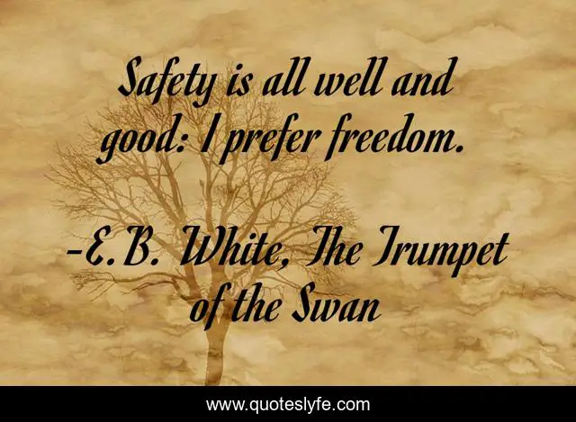 This page presents the quote "Safety is all well and good: I prefer freedom.". Author of this quote is E.B. White, The Trumpet of the Swan. This quote is about freedom, the-trumpet-of-the-swan,.