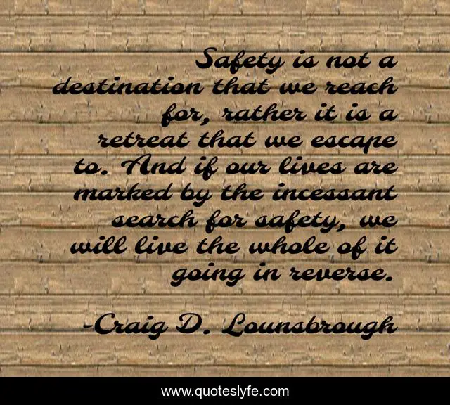 This page presents the quote "Safety is not a destination that we reach for, rather it is a retreat that we escape to. And if our lives are marked by the incessant search for safety, we will live the whole of it going in reverse.". Author of this quote is Craig D. Lounsbrough. This quote is about search, backwards, flight, reverse, flee, destination, searching, running, journey,.