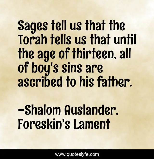 This page presents the quote "Sages tell us that the Torah tells us that until the age of thirteen, all of boy's sins are ascribed to his father.". Author of this quote is Shalom Auslander, Foreskin's Lament. This quote is about sin, torah,.