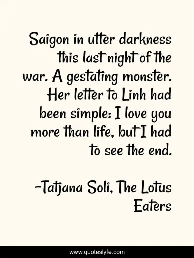 This page presents the quote "Saigon in utter darkness this last night of the war. A gestating monster. Her letter to Linh had been simple: I love you more than life, but I had to see the end.". Author of this quote is Tatjana Soli, The Lotus Eaters. .