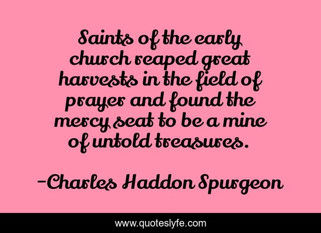 This page presents the quote "Saints of the early church reaped great harvests in the field of prayer and found the mercy seat to be a mine of untold treasures.". Author of this quote is Charles Haddon Spurgeon. .