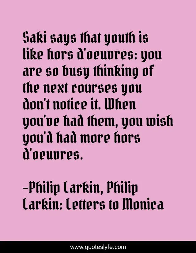 This page presents the quote "Saki says that youth is like hors d'oeuvres: you are so busy thinking of the next courses you don't notice it. When you've had them, you wish you'd had more hors d'oeuvres.". Author of this quote is Philip Larkin, Philip Larkin: Letters to Monica. This quote is about letters, poetry, letters-to-monica, writing, youth, poet,.