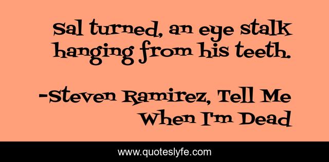 This page presents the quote "Sal turned, an eye stalk hanging from his teeth.". Author of this quote is Steven Ramirez, Tell Me When I'm Dead. This quote is about drunk, novel, dead, zombie-thriller, soldiers, paranormal-thriller, horde, na, hordes,.