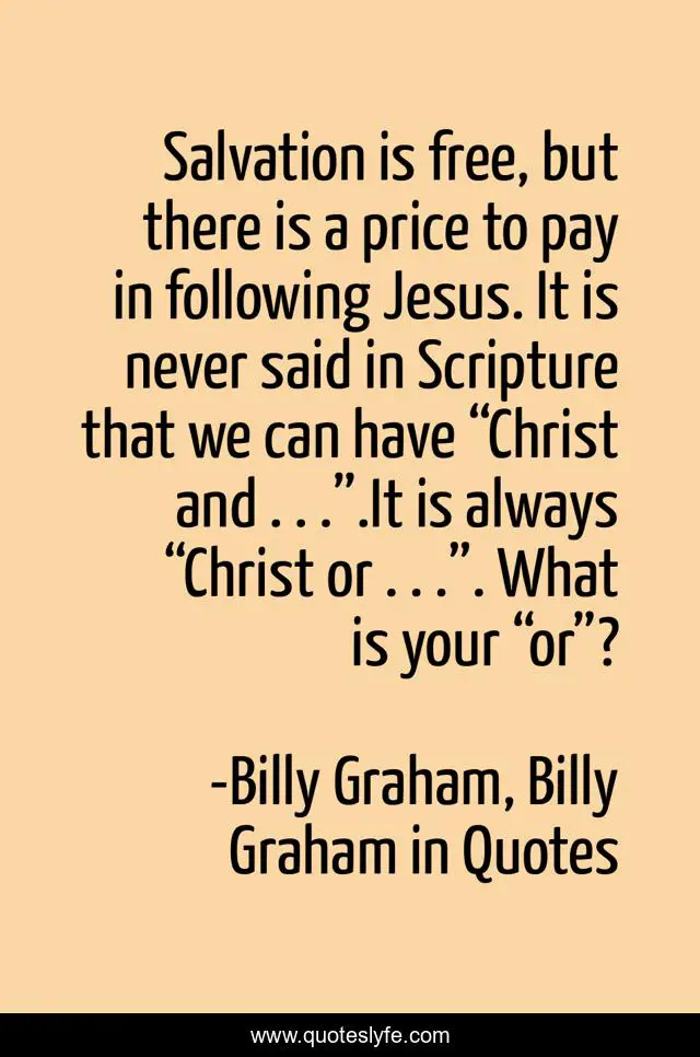This page presents the quote "Salvation is free, but there is a price to pay in following Jesus. It is never said in Scripture that we can have “Christ and . . .”.It is always “Christ or . . .”. What is your “or”?". Author of this quote is Billy Graham, Billy Graham in Quotes. This quote is about followers, billy-graham,.