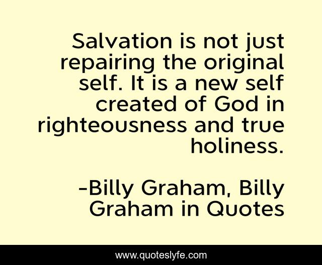 This page presents the quote "Salvation is not just repairing the original self. It is a new self created of God in righteousness and true holiness.". Author of this quote is Billy Graham, Billy Graham in Quotes. This quote is about salvation, billy-graham,.