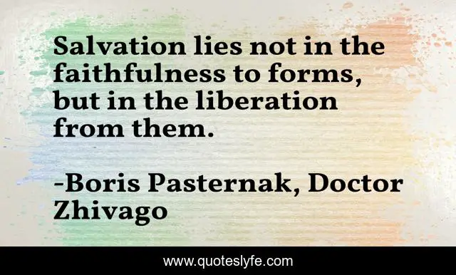 This page presents the quote "Salvation lies not in the faithfulness to forms, but in the liberation from them.". Author of this quote is Boris Pasternak, Doctor Zhivago. This quote is about faith, iconoclasm, liberty, originality, nonconformity, salvation, tradition, individualism,.