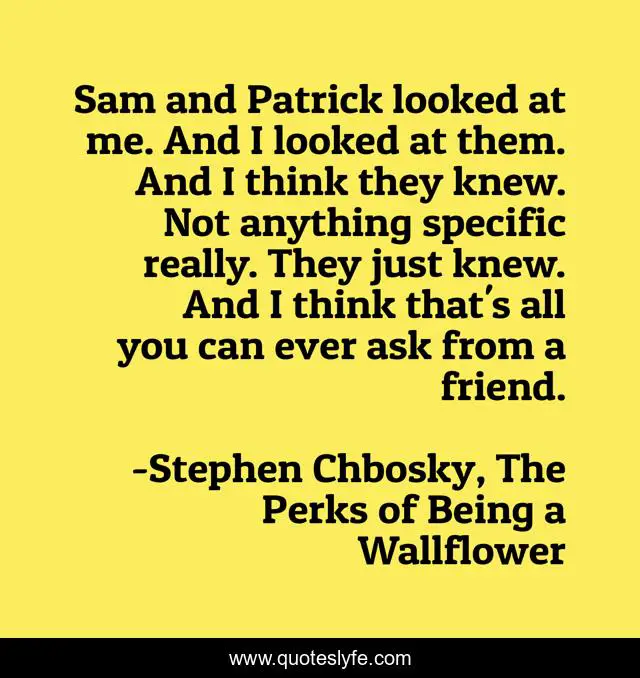 This page presents the quote "Sam and Patrick looked at me. And I looked at them. And I think they knew. Not anything specific really. They just knew. And I think that's all you can ever ask from a friend.". Author of this quote is Stephen Chbosky, The Perks of Being a Wallflower. This quote is about chbosky, friendship,.