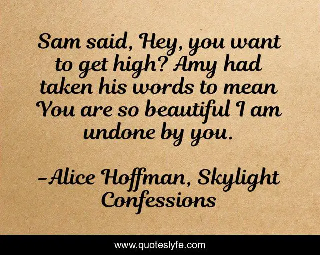 This page presents the quote "Sam said, Hey, you want to get high? Amy had taken his words to mean You are so beautiful I am undone by you.". Author of this quote is Alice Hoffman, Skylight Confessions. This quote is about drugs, love, affection,.