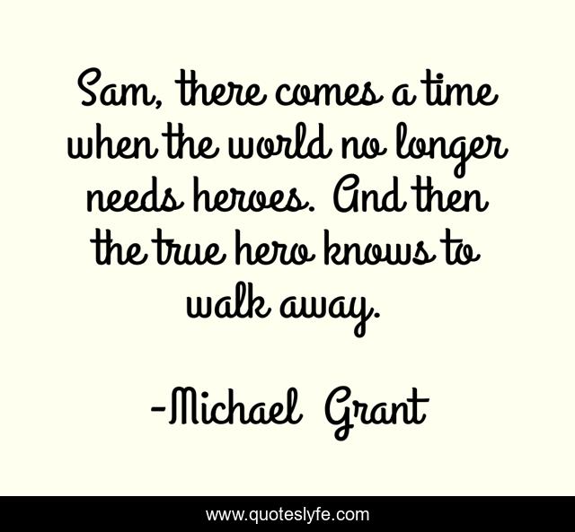 This page presents the quote "Sam, there comes a time when the world no longer needs heroes. And then the true hero knows to walk away.". Author of this quote is Michael Grant. This quote is about 11, prophetess, hero, sam, lies, michael-grant, orsay, dreams,.