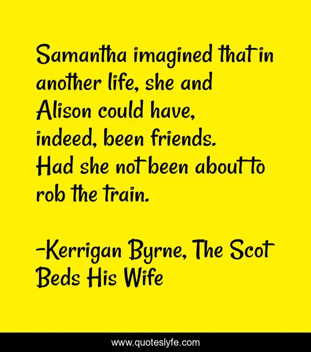 This page presents the quote "Samantha imagined that in another life, she and Alison could have, indeed, been friends. Had she not been about to rob the train.". Author of this quote is Kerrigan Byrne, The Scot Beds His Wife. This quote is about historical-romance, notorious-rake, scotland, annie-oakley, highlander, romance, wild-west,.