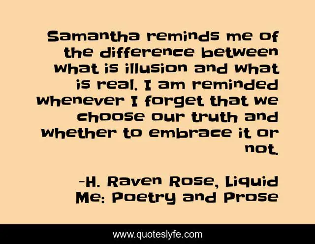 This page presents the quote "Samantha reminds me of the difference between what is illusion and what is real. I am reminded whenever I forget that we choose our truth and whether to embrace it or not.". Author of this quote is H. Raven Rose, Liquid Me: Poetry and Prose. This quote is about real, embracing-truth, truth, illusion,.