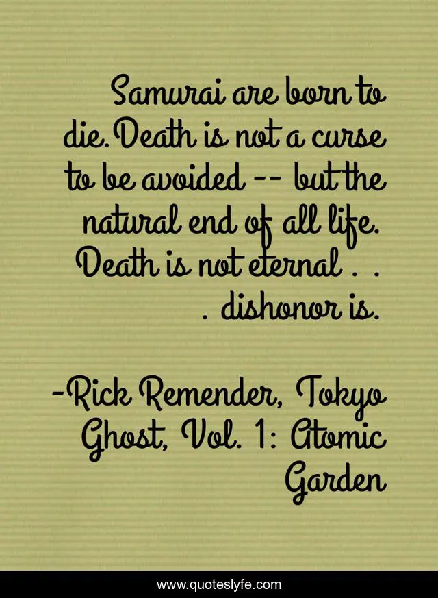 This page presents the quote "Samurai are born to die.Death is not a curse to be avoided -- but the natural end of all life. Death is not eternal . . . dishonor is.". Author of this quote is Rick Remender, Tokyo Ghost, Vol. 1: Atomic Garden. This quote is about death, rick-remender, gengeance, atomic-garden, dishonor, revenge, tokyo-ghost, samurai, curse,.