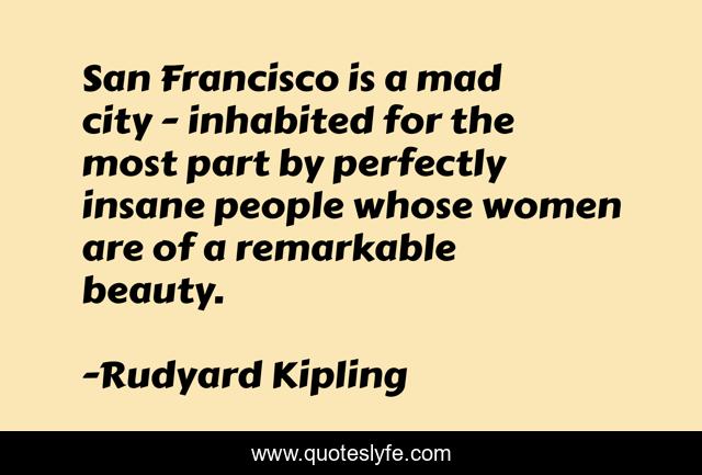 This page presents the quote "San Francisco is a mad city - inhabited for the most part by perfectly insane people whose women are of a remarkable beauty.". Author of this quote is Rudyard Kipling. This quote is about city, women, people,.