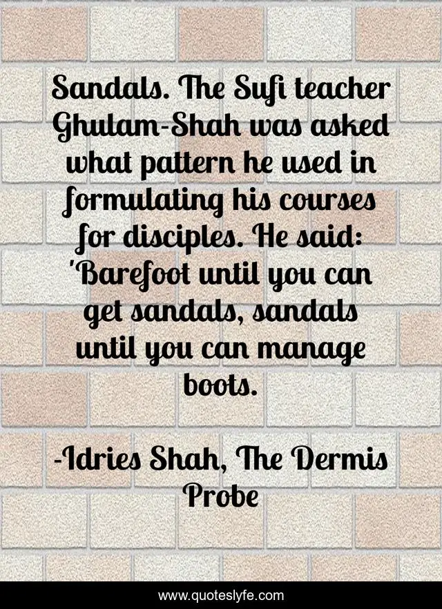 This page presents the quote "Sandals. The Sufi teacher Ghulam-Shah was asked what pattern he used in formulating his courses for disciples. He said: 'Barefoot until you can get sandals, sandals until you can manage boots.". Author of this quote is Idries Shah, The Dermis Probe. This quote is about sufism, enlightenment, sufis, truth,.