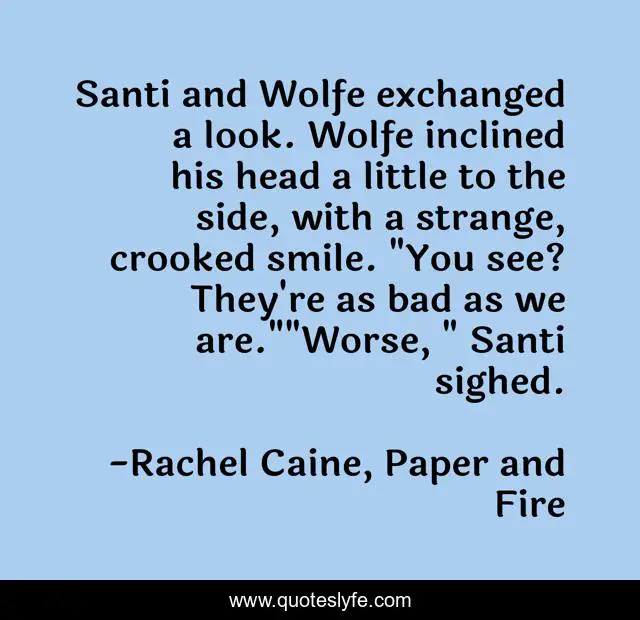 "Rachel Caine, Paper and Fire Quotes." Quoteslyfe.com, 2025. Fri. 05 Dec. 2025. <https://www.quoteslyfe.com/quote/Santi-and-Wolfe-exchanged-a-look-Wolfe-126718>.