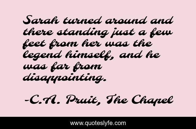 This page presents the quote "Sarah turned around and there standing just a few feet from her was the legend himself, and he was far from disappointing.". Author of this quote is C.A. Pruit, The Chapel. This quote is about romance, erotica, salem, wicca, history,.