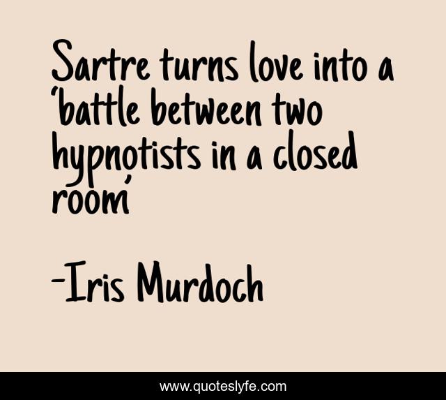 This page presents the quote "Sartre turns love into a ‘battle between two hypnotists in a closed room’.". Author of this quote is Iris Murdoch. This quote is about existentialism, philosophy, sartre,.