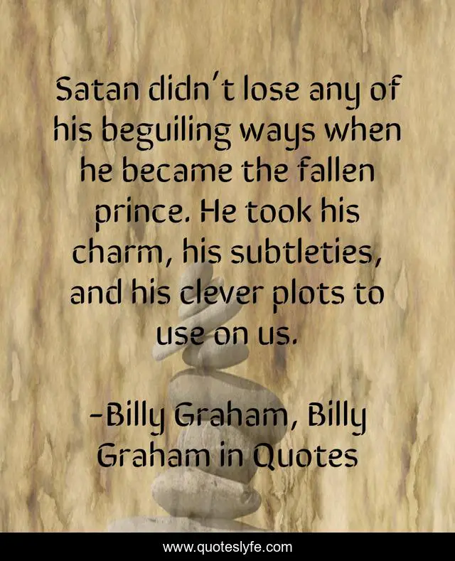 This page presents the quote "Satan didn’t lose any of his beguiling ways when he became the fallen prince. He took his charm, his subtleties, and his clever plots to use on us.". Author of this quote is Billy Graham, Billy Graham in Quotes. This quote is about devil, satan, billy-graham,.