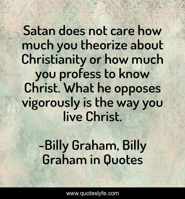 This page presents the quote "Satan does not care how much you theorize about Christianity or how much you profess to know Christ. What he opposes vigorously is the way you live Christ.". Author of this quote is Billy Graham, Billy Graham in Quotes. This quote is about devil, satan, billy-graham,.