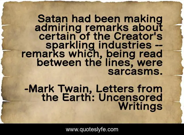 This page presents the quote "Satan had been making admiring remarks about certain of the Creator's sparkling industries -- remarks which, being read between the lines, were sarcasms.". Author of this quote is Mark Twain, Letters from the Earth: Uncensored Writings. This quote is about god, satan,.