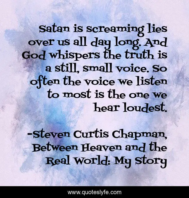 This page presents the quote "Satan is screaming lies over us all day long. And God whispers the truth is a still, small voice. So often the voice we listen to most is the one we hear loudest.". Author of this quote is Steven Curtis Chapman, Between Heaven and the Real World: My Story. This quote is about god, still-small-voice, satan,.